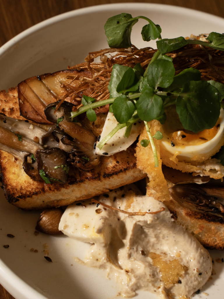 Wild Mushroom, Garlic, Crumbed Boiled Egg, Miso Eggplan Puree, Pine Nut Dukkah On Focaccia