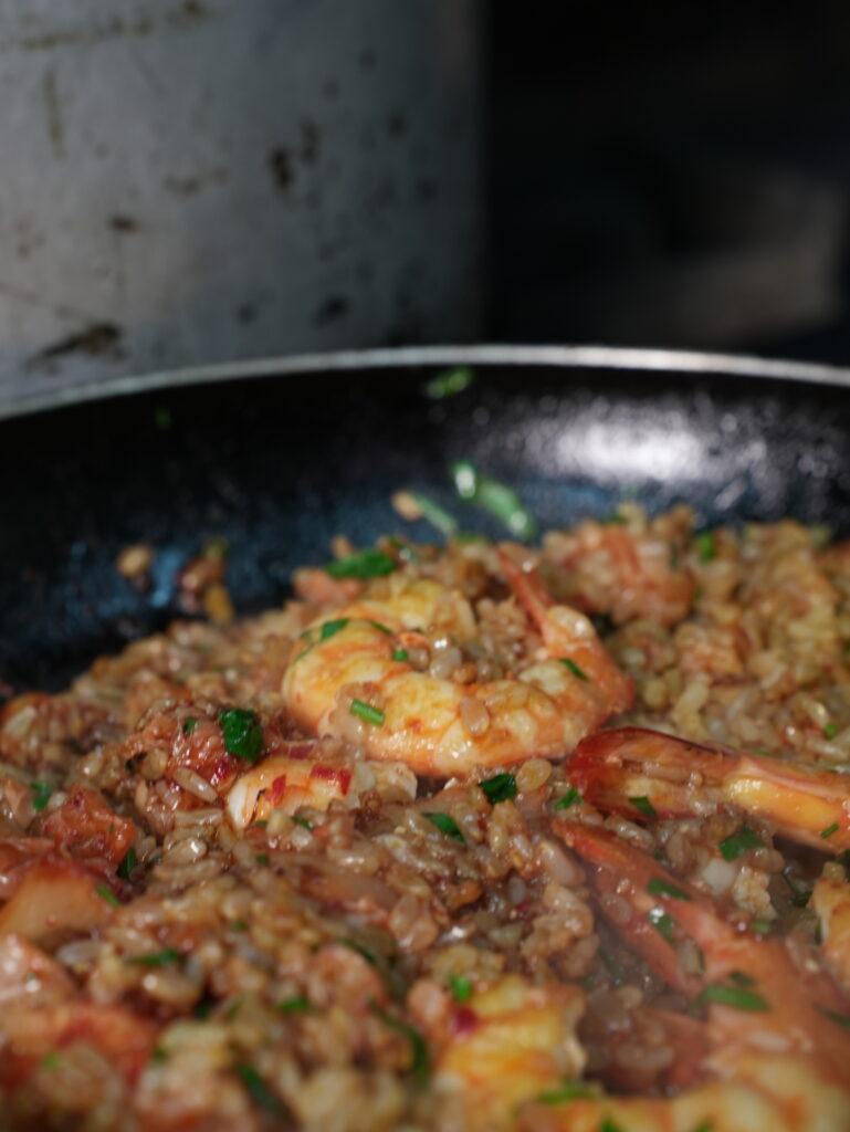 King Prawn, Poached Egg, Brown Rice, Picked Cabbage, Nduja, Snap Peas, Garlic
