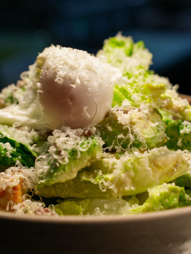 Poached Egg, Bacon, Anchovy, Cos Lettuce, Garlic Crouton, Avocado