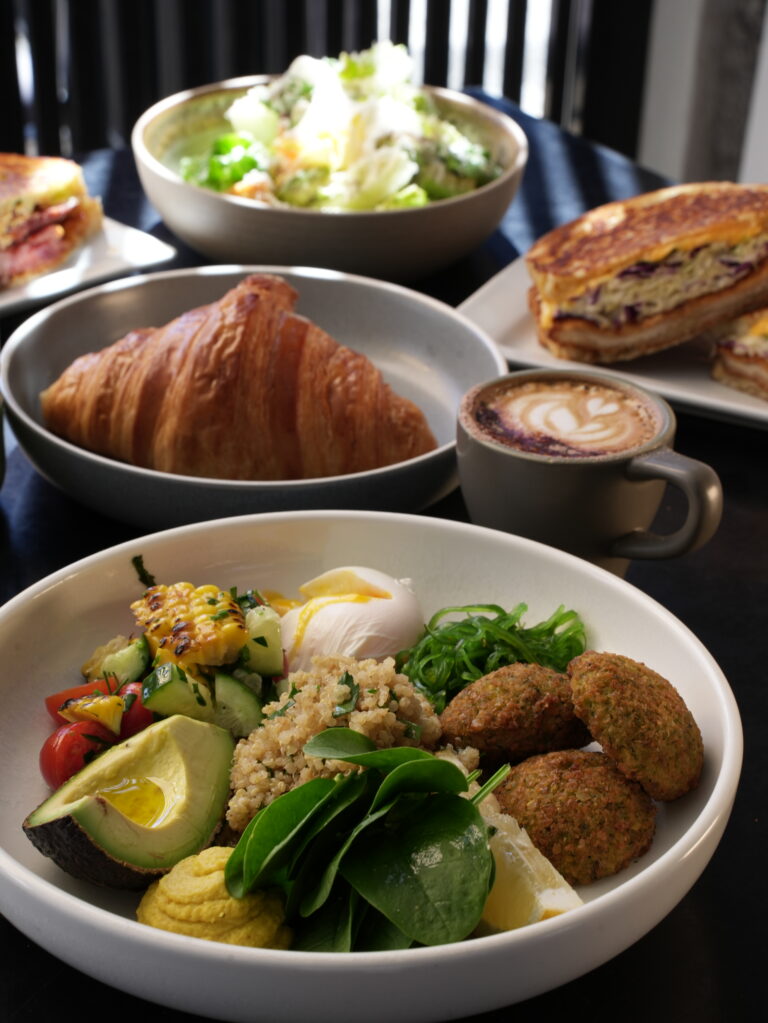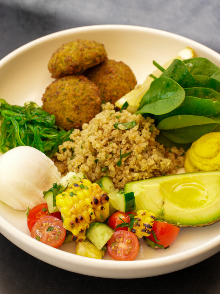 Quinoa, Seaweed, Cucumber, Corn & Tomato Salad, Avocado, Falafel, Spinach, Turmeric Hummus, Poached Egg with Macadamia Dressing